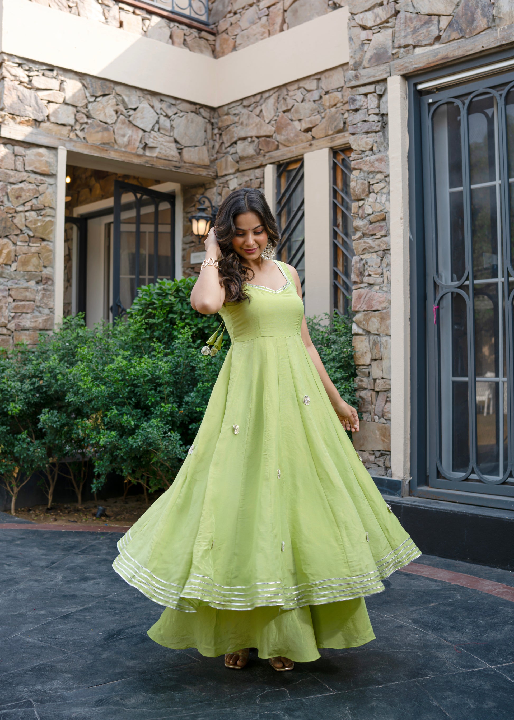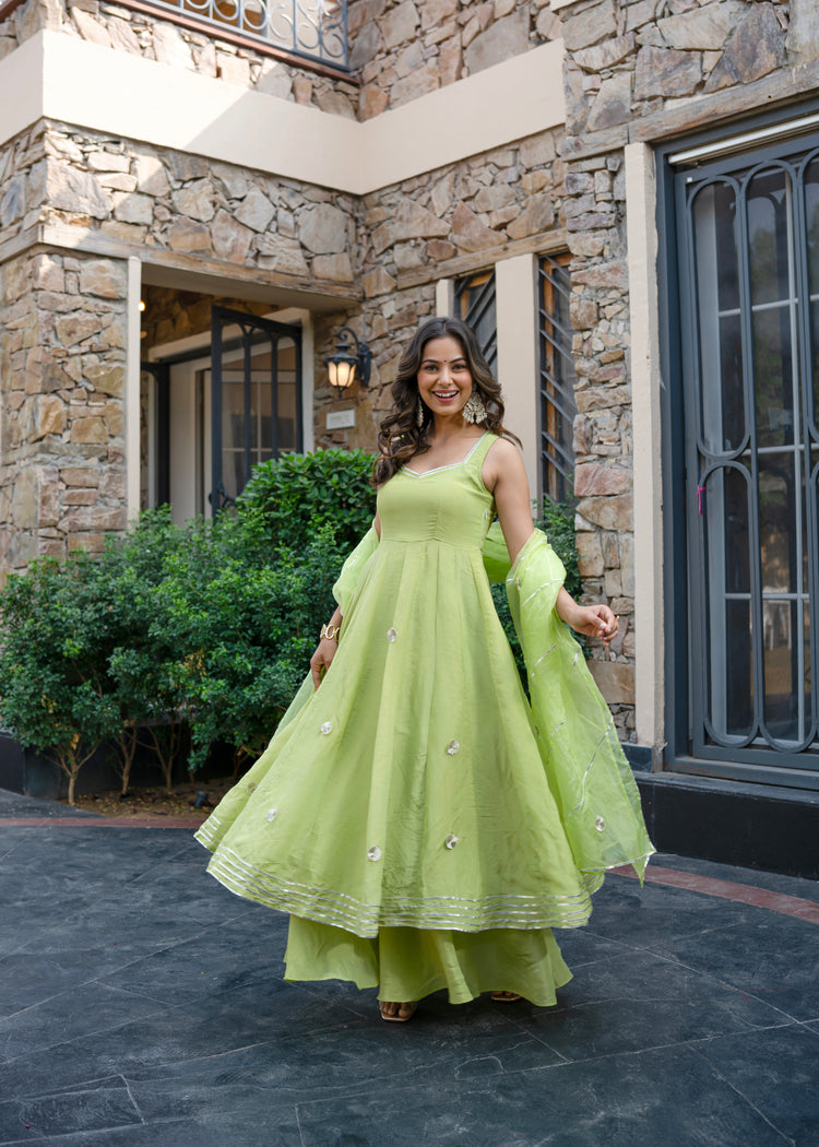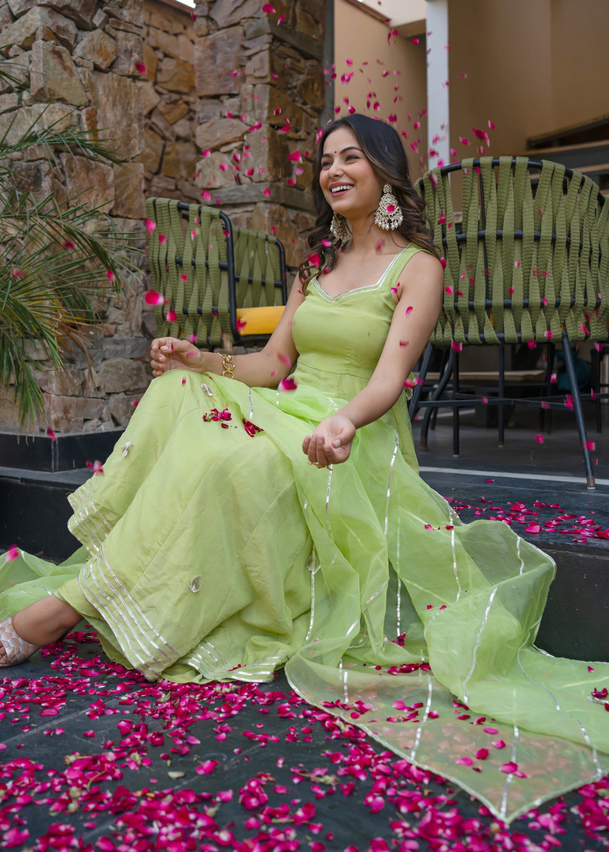 Radiate festive charm with the Parisha Tissue Suit Set, a perfect fusion of freshness and finesse. Crafted from lustrous tissue cosmos fabric lined with soft cotton, the sleeveless kurta features a 48-inch length, 7-inch front neckline, and 11-inch back neckline — designed for a flattering and graceful look. The delicate sheen and soft pastel hue make it a statement of effortless elegance.