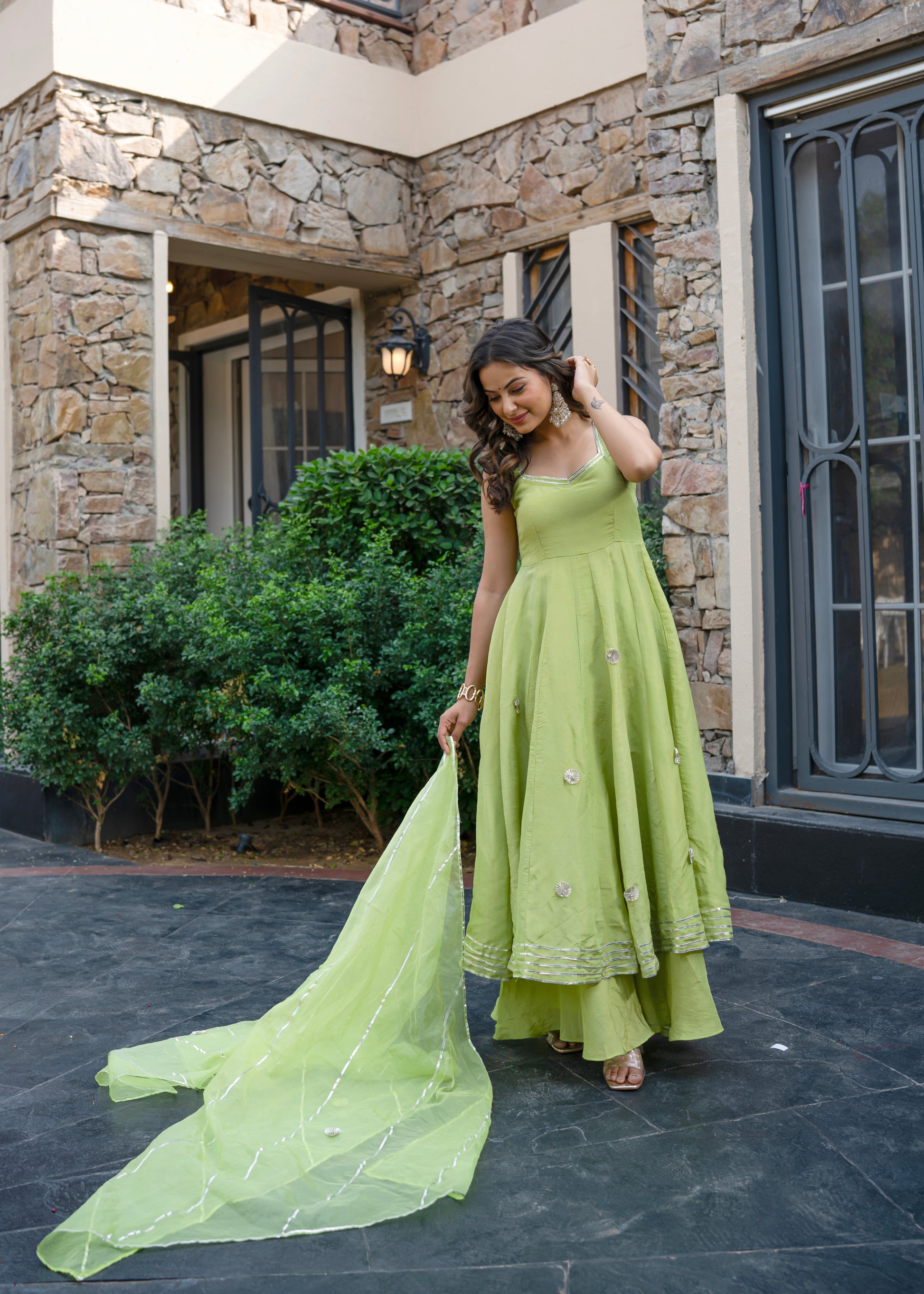 Paired with 40-inch cotton-lined tissue palazzos for unmatched comfort and flow, the set is beautifully completed with a 2.3-meter organza dupatta embellished with subtle silver detailing. Perfect for celebrations and festive evenings, this ensemble embodies lightness, luxury, and timeless style.
