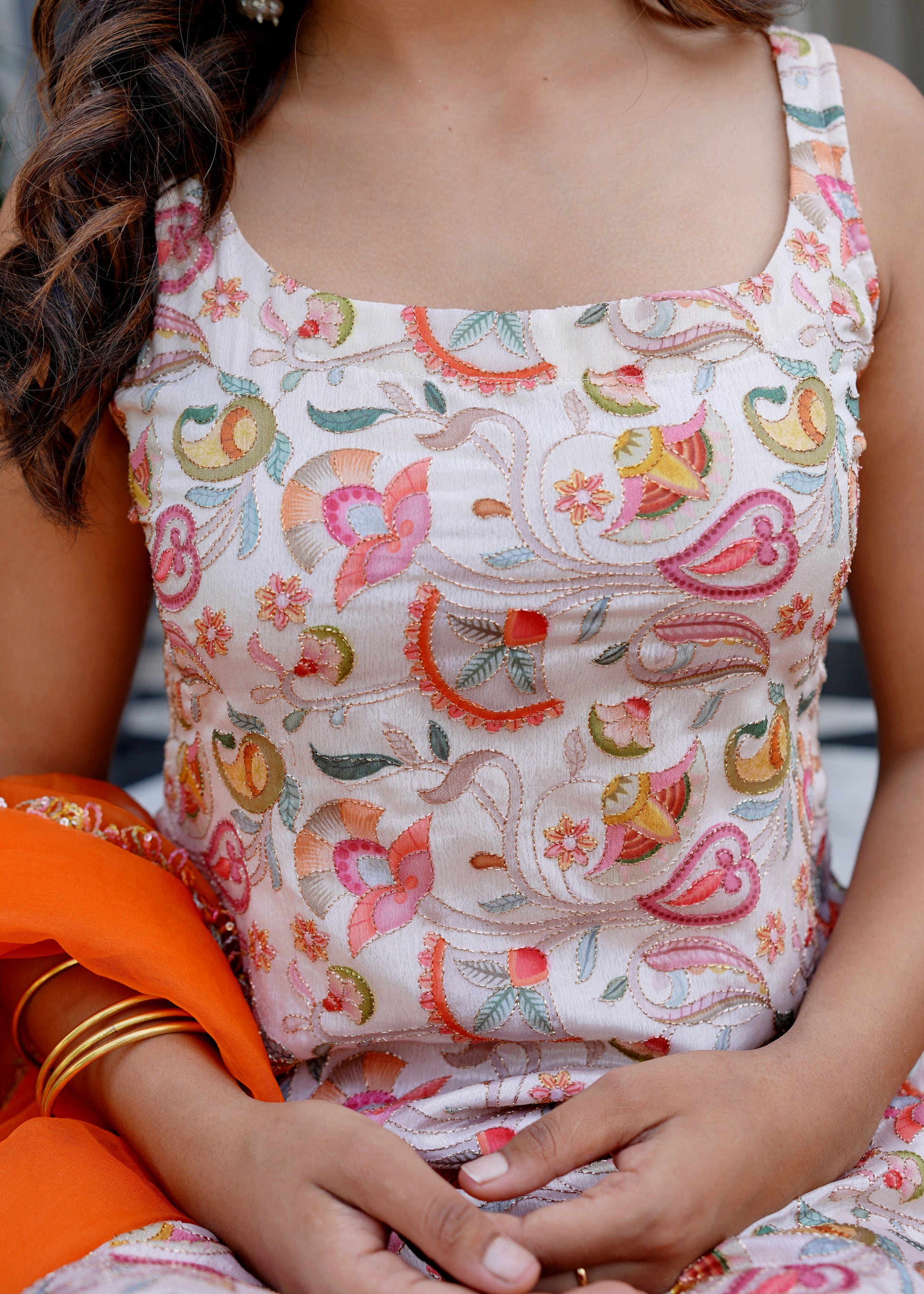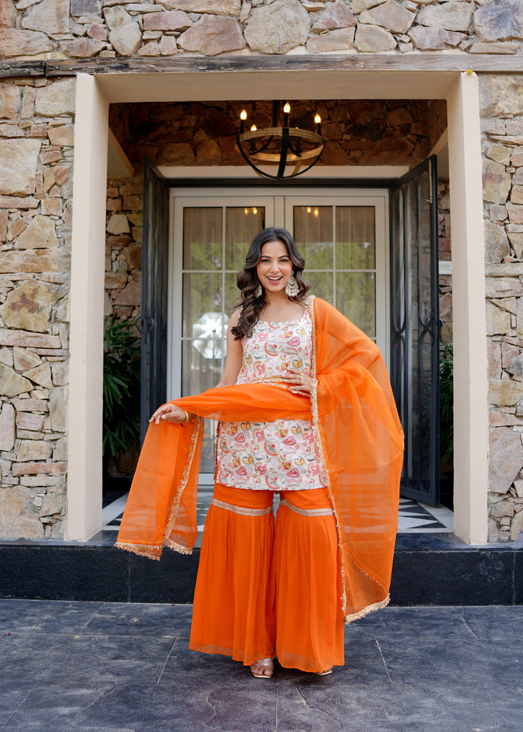 The Amber Glow Sharara Set brings a burst of warmth and joy to any celebration. The embroidered sleeveless kurta, featuring delicate multi-color threadwork on a soft base, pairs elegance with vibrancy. Its 34-inch length, 7-inch front neckline, and 11-inch back neckline create a chic, flattering silhouette that captures modern festive charm.