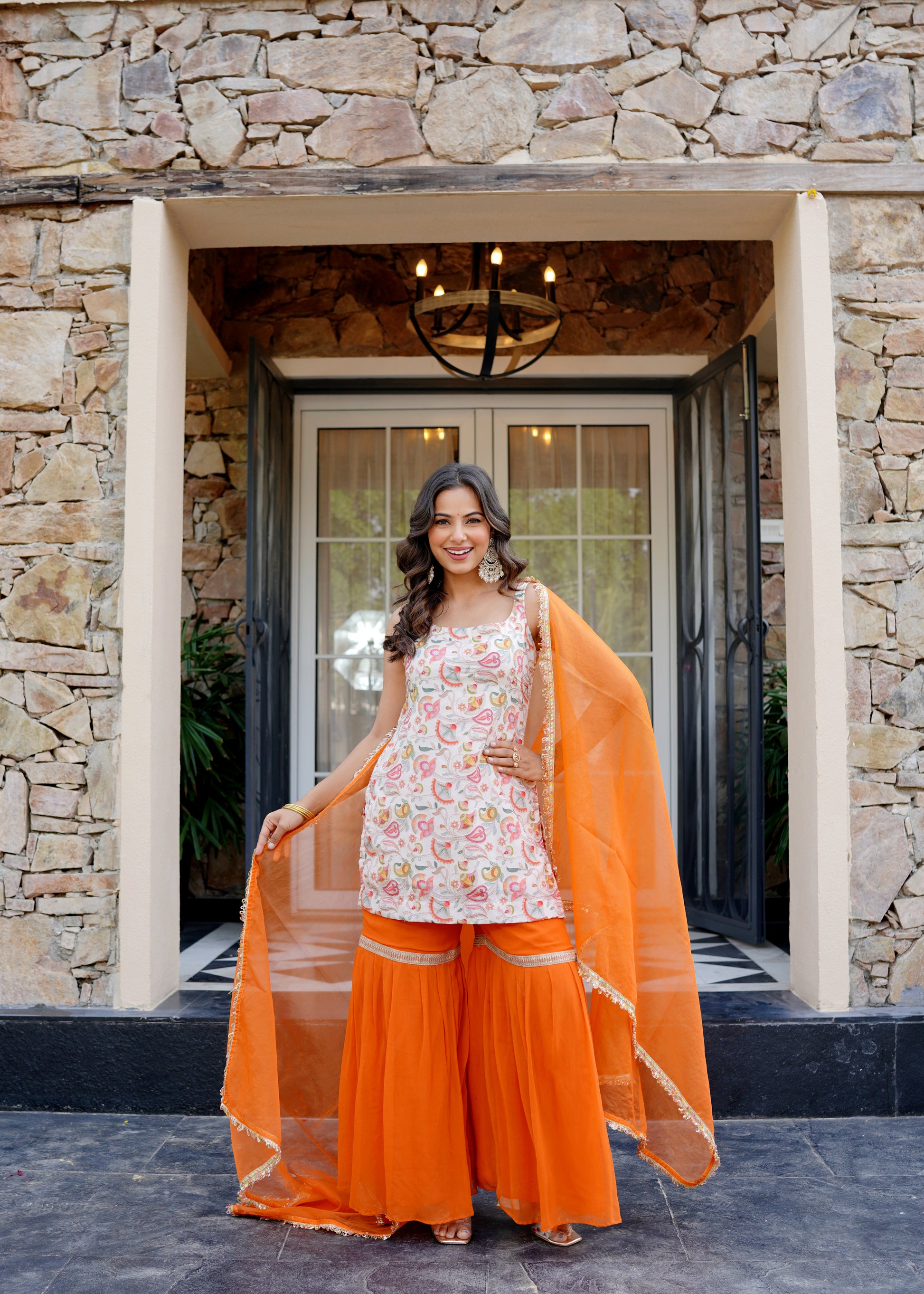 Complementing the kurta are 40-inch flowing georgette sharara pants in a rich amber hue, adding both movement and comfort. A 2.3-meter organza dupatta with subtle golden accents completes the look — airy, graceful, and effortlessly stylish. Perfect for festive gatherings, this ensemble celebrates color, craft, and confidence.