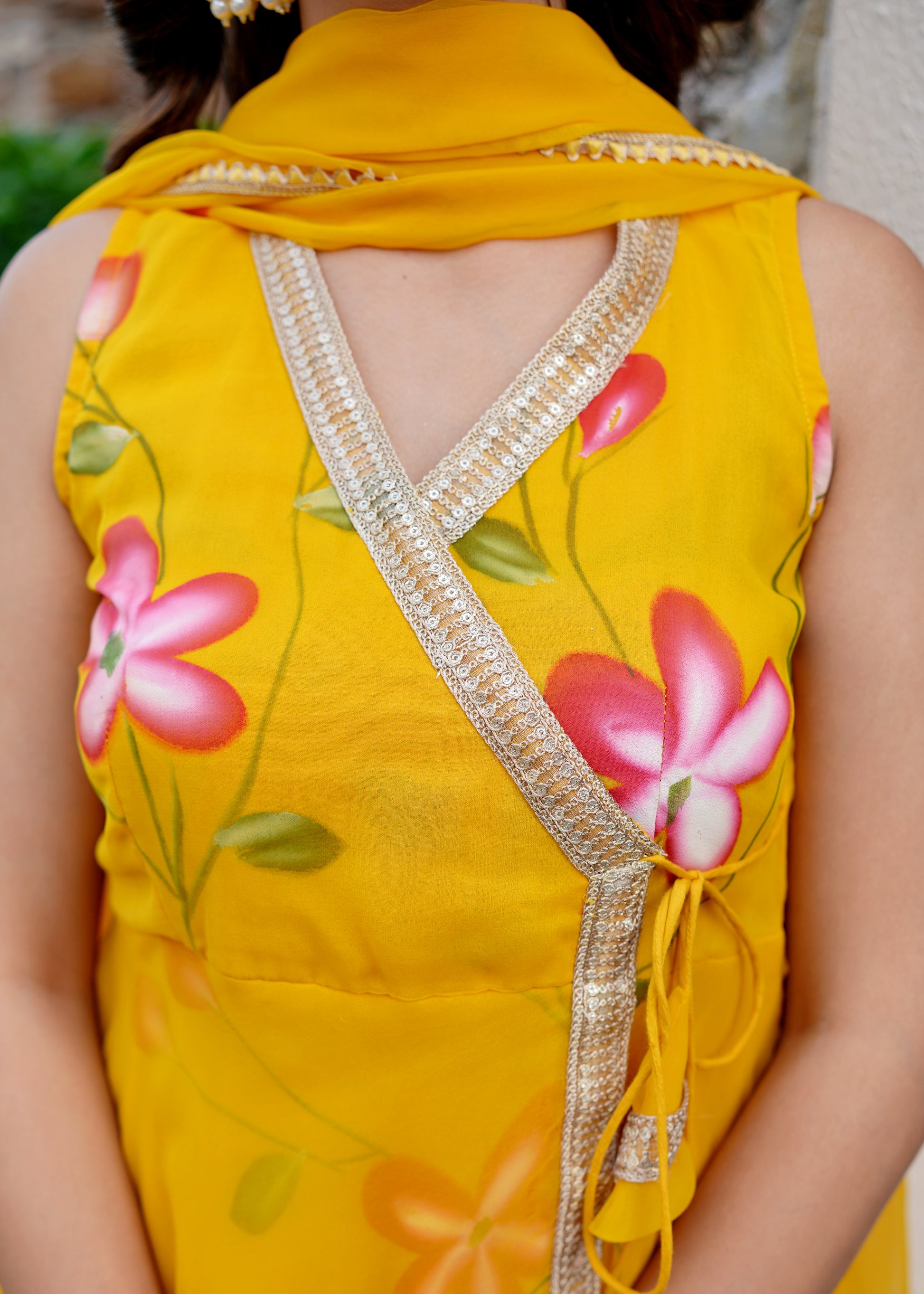 Radiate sunshine and joy in the Inaya Kurta Sharara Set — a perfect blend of playful elegance and festive flair. Crafted from lightweight georgette, the sleeveless kurta features delicate floral embroidery and a flared silhouette that moves beautifully with every step. Its bright yellow hue adds a refreshing vibrancy, making it an ideal choice for daytime celebrations or festive gatherings.