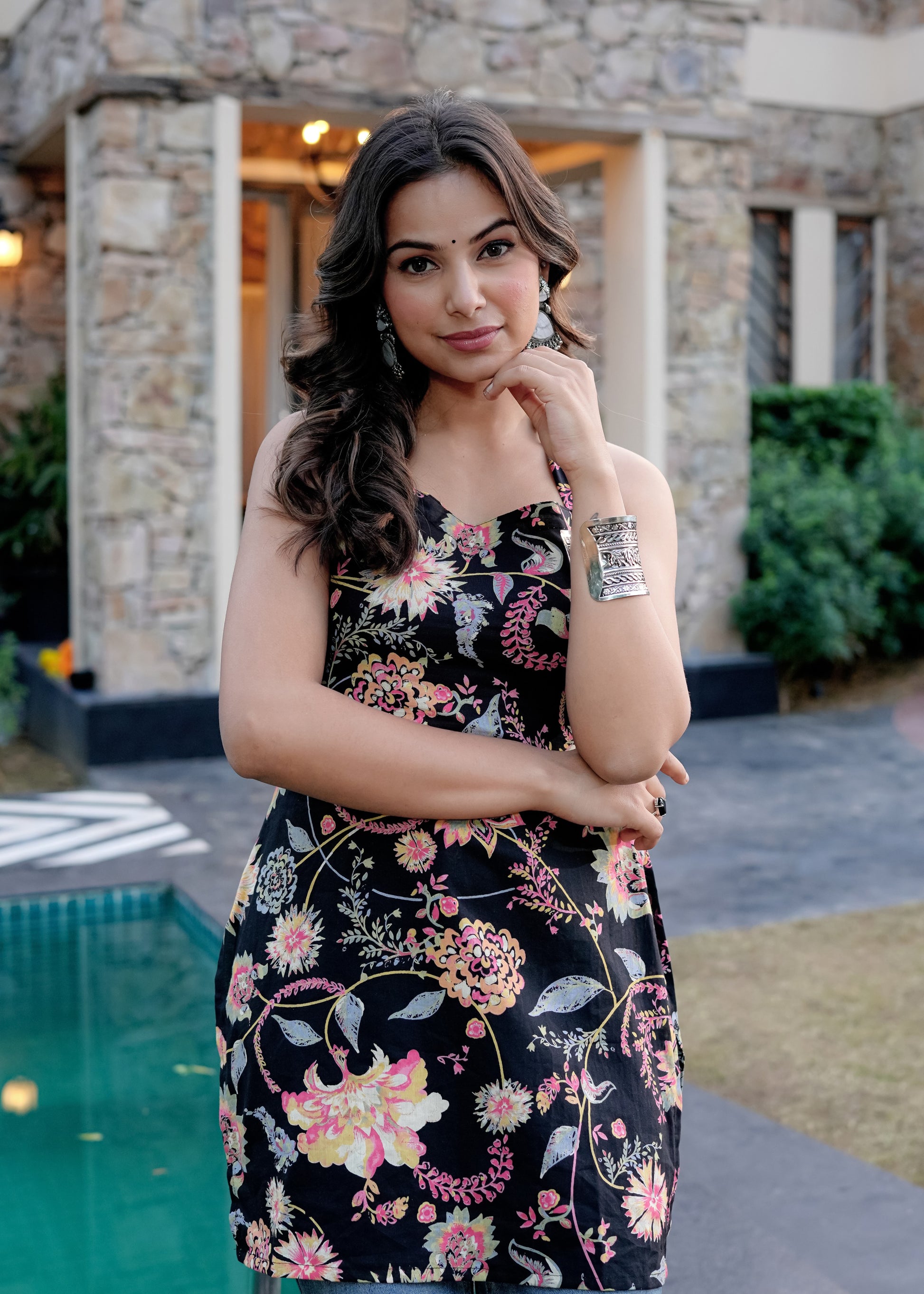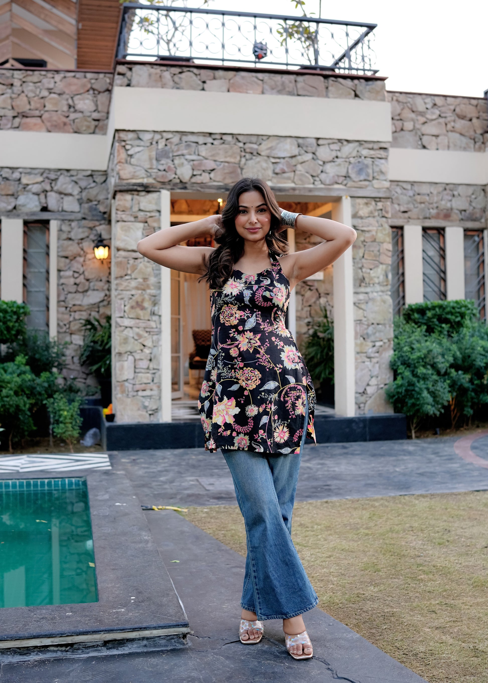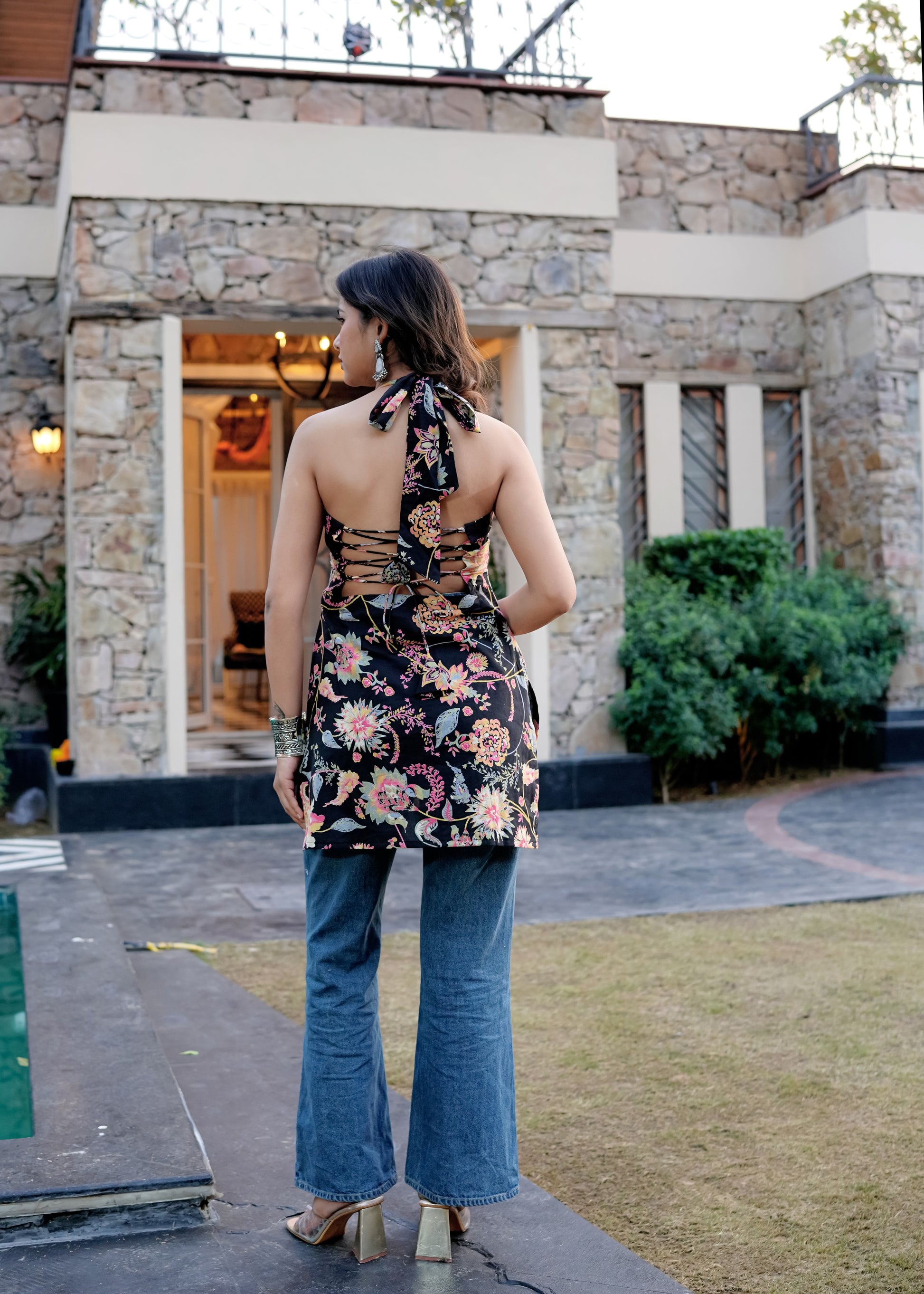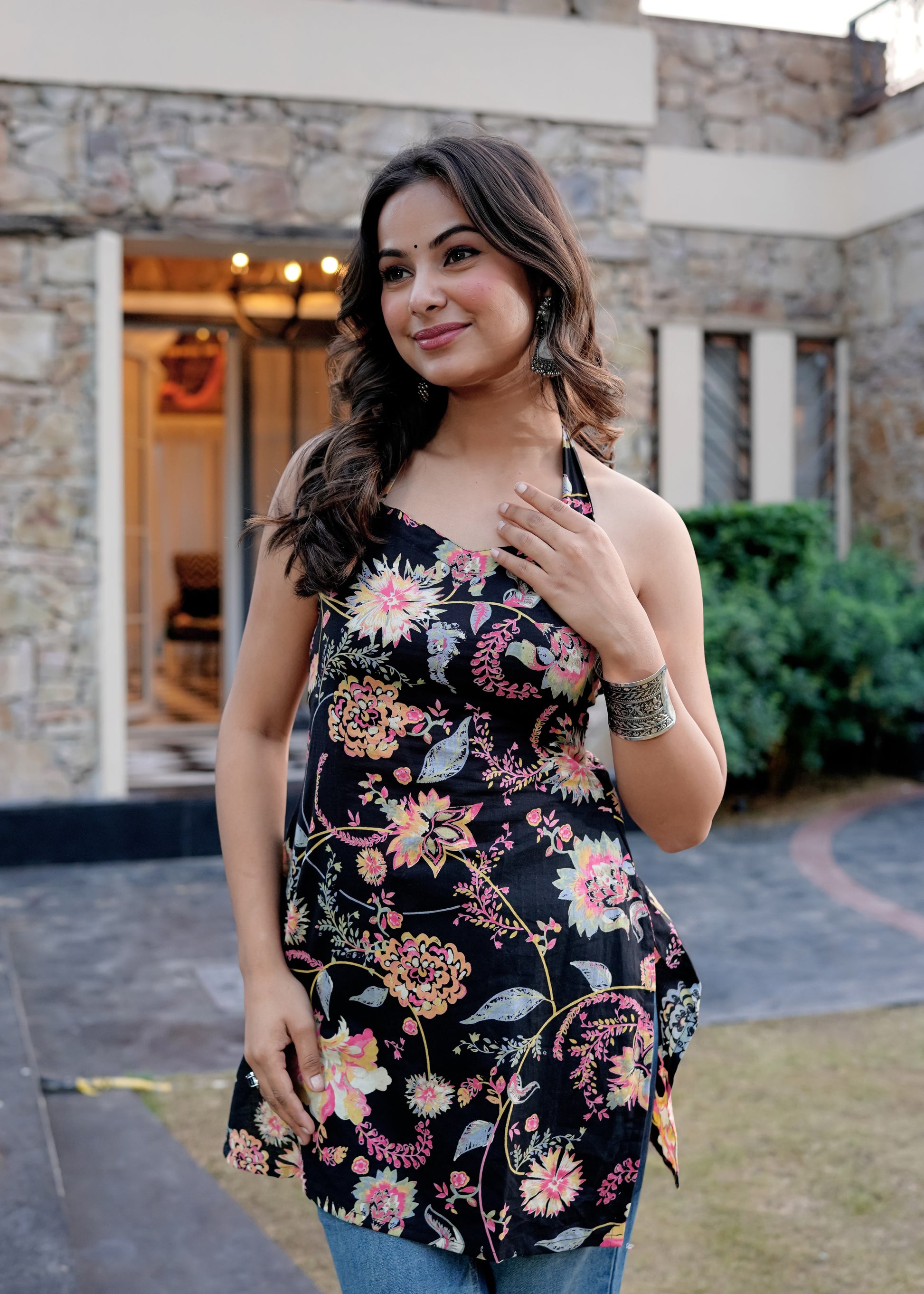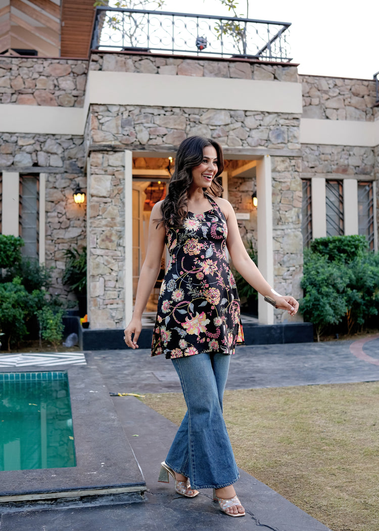 The Kiara Halter Neck Short Kurti is designed for the modern woman who loves a hint of boldness in her ethnic wear. Crafted from premium cotton, this 32-inch kurti features a stylish halter neckline and a flattering fit that enhances your silhouette with effortless charm. The vibrant floral print adds a touch of elegance, making it a versatile pick for brunches, casual outings, or festive evenings.
