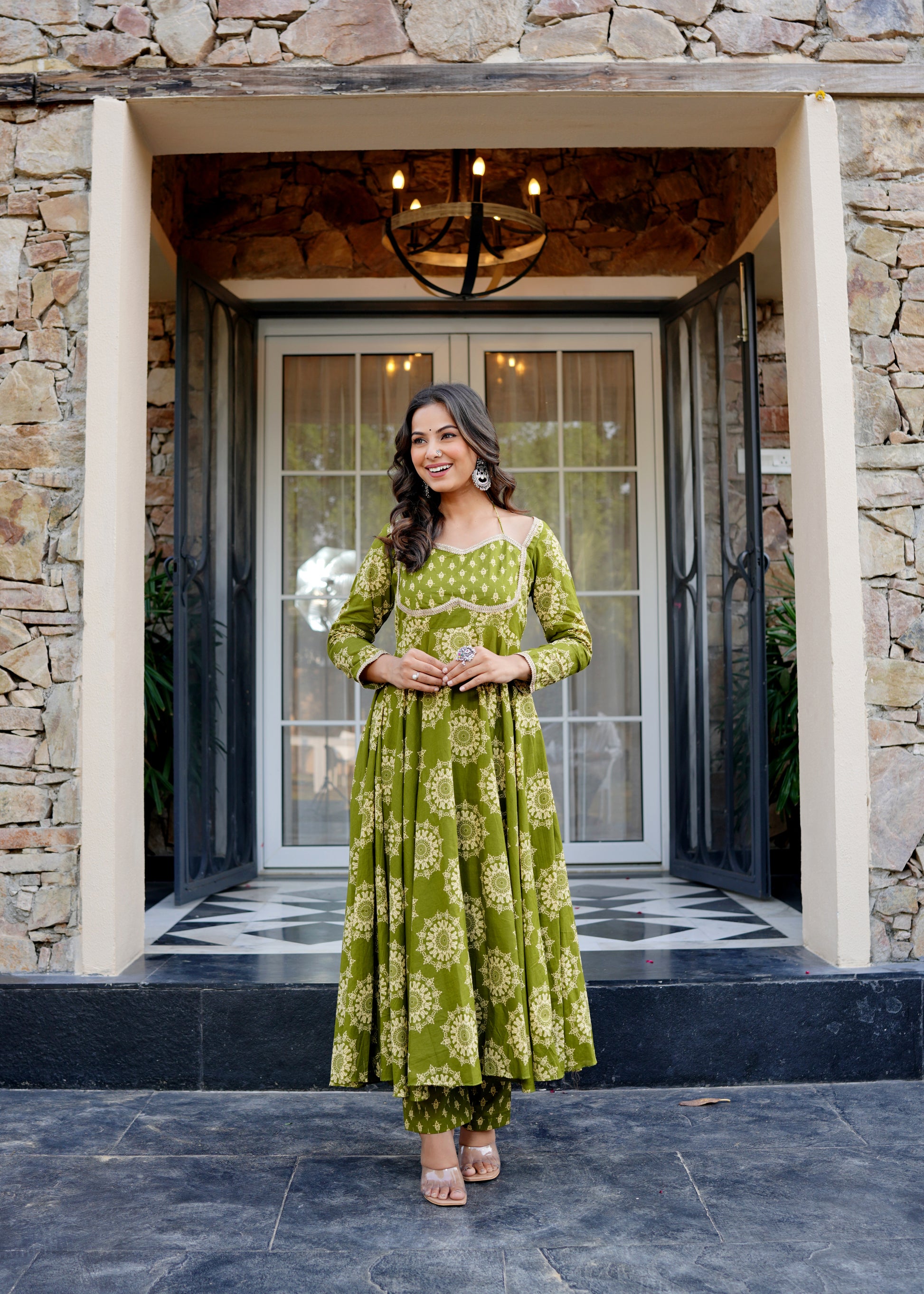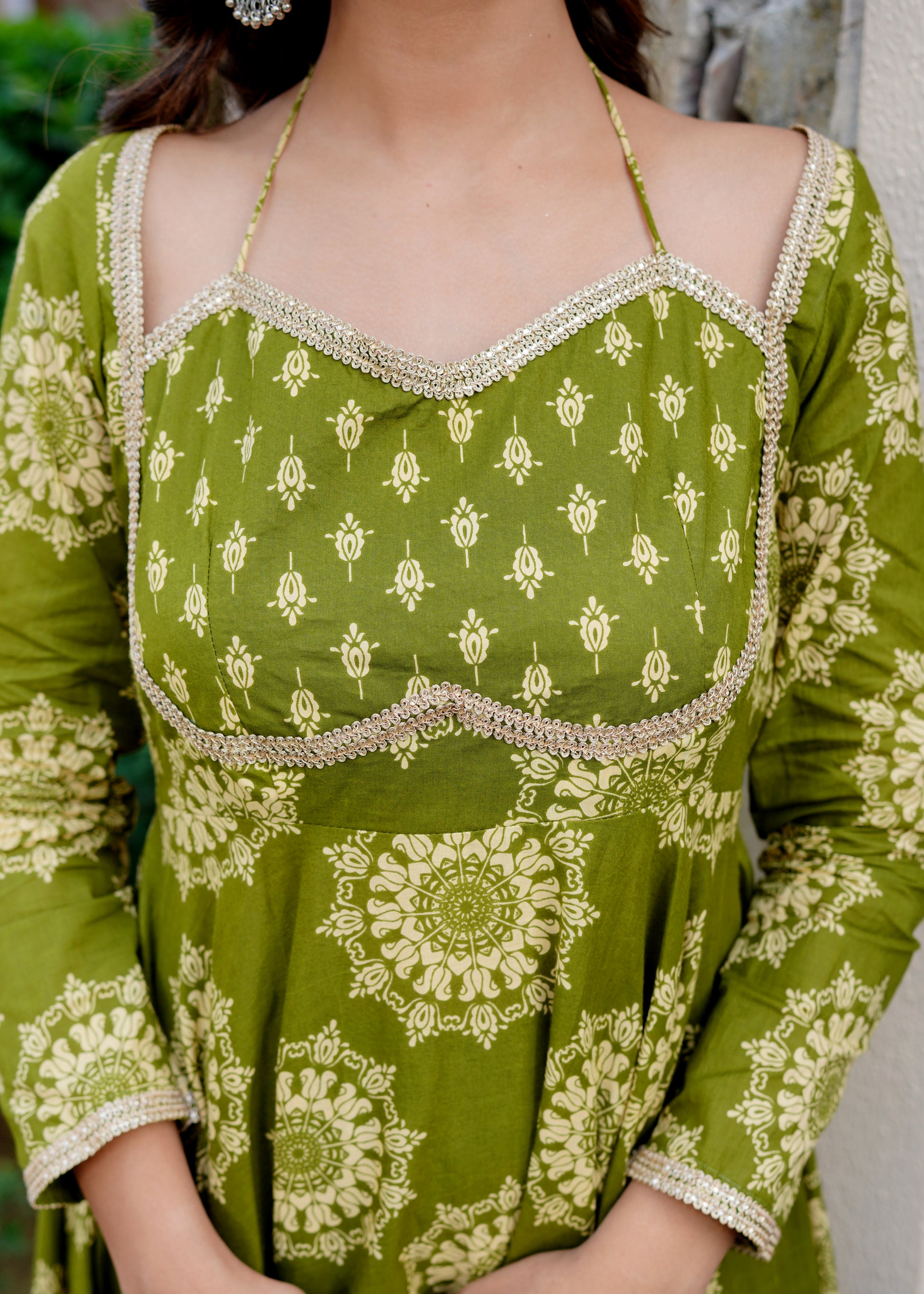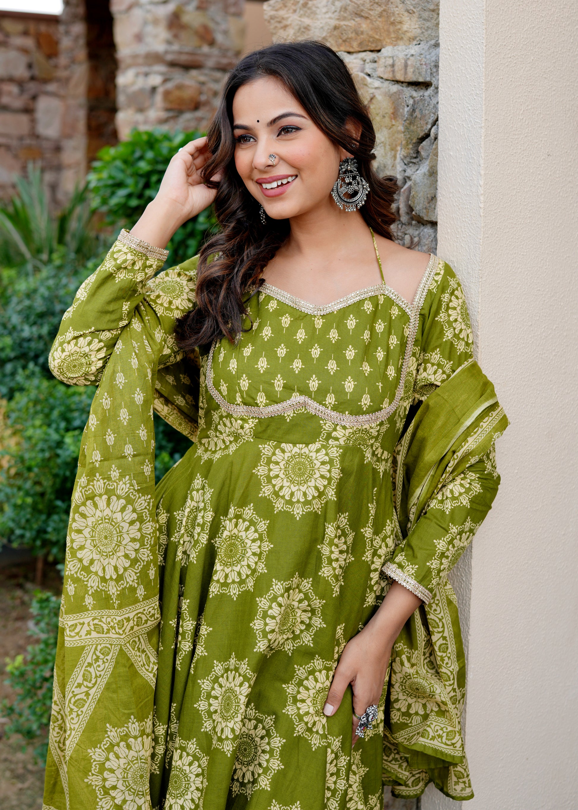 The Noorin Cotton Suit Set is where timeless tradition meets easy elegance. Crafted from soft, breathable cotton, the Anarkali-style kurta features a graceful 48-inch flowy length, a halter neckline for a modern touch, and 22-inch sleeves for added charm. The intricate printed patterns bring a touch of classic Indian artistry to this refreshing green ensemble.