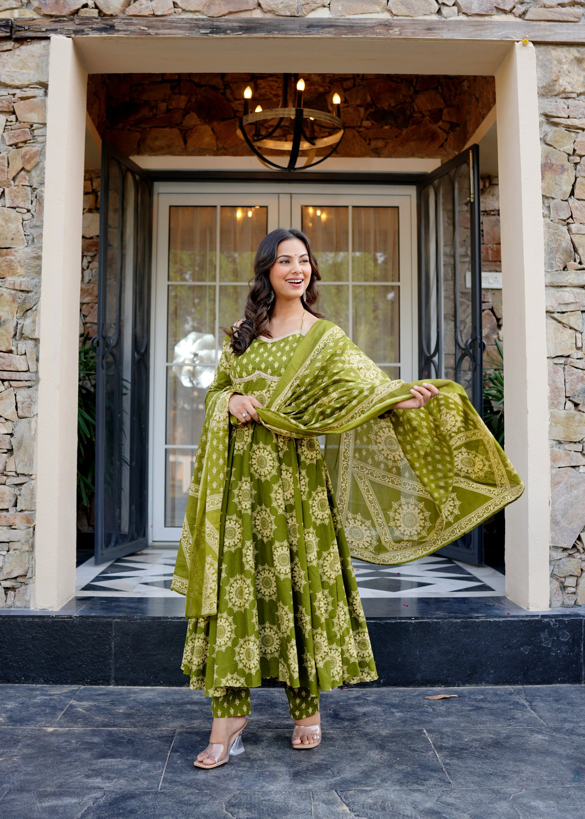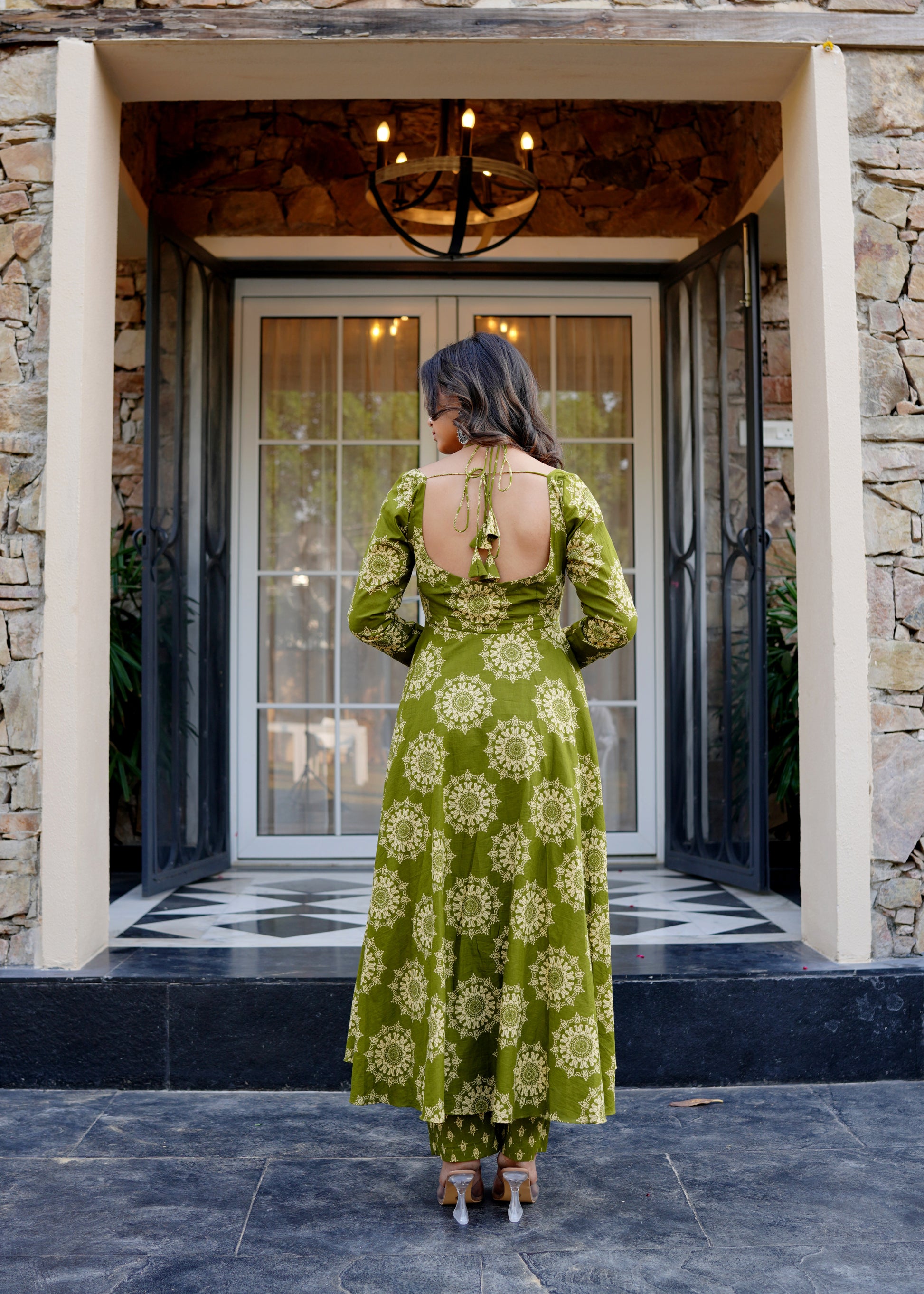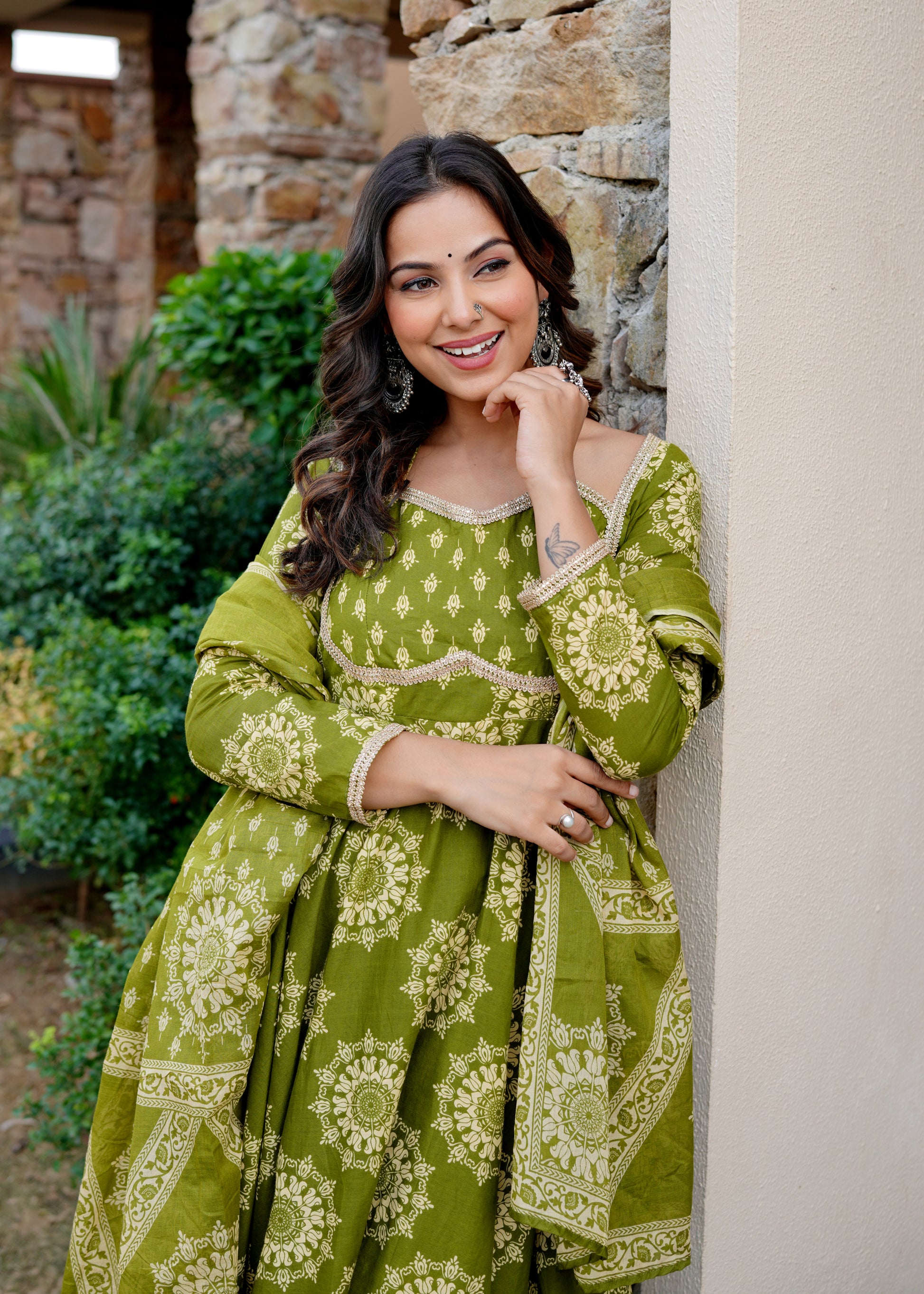 The Noorin Cotton Suit Set is where timeless tradition meets easy elegance. Crafted from soft, breathable cotton, the Anarkali-style kurta features a graceful 48-inch flowy length, a halter neckline for a modern touch, and 22-inch sleeves for added charm. The intricate printed patterns bring a touch of classic Indian artistry to this refreshing green ensemble.