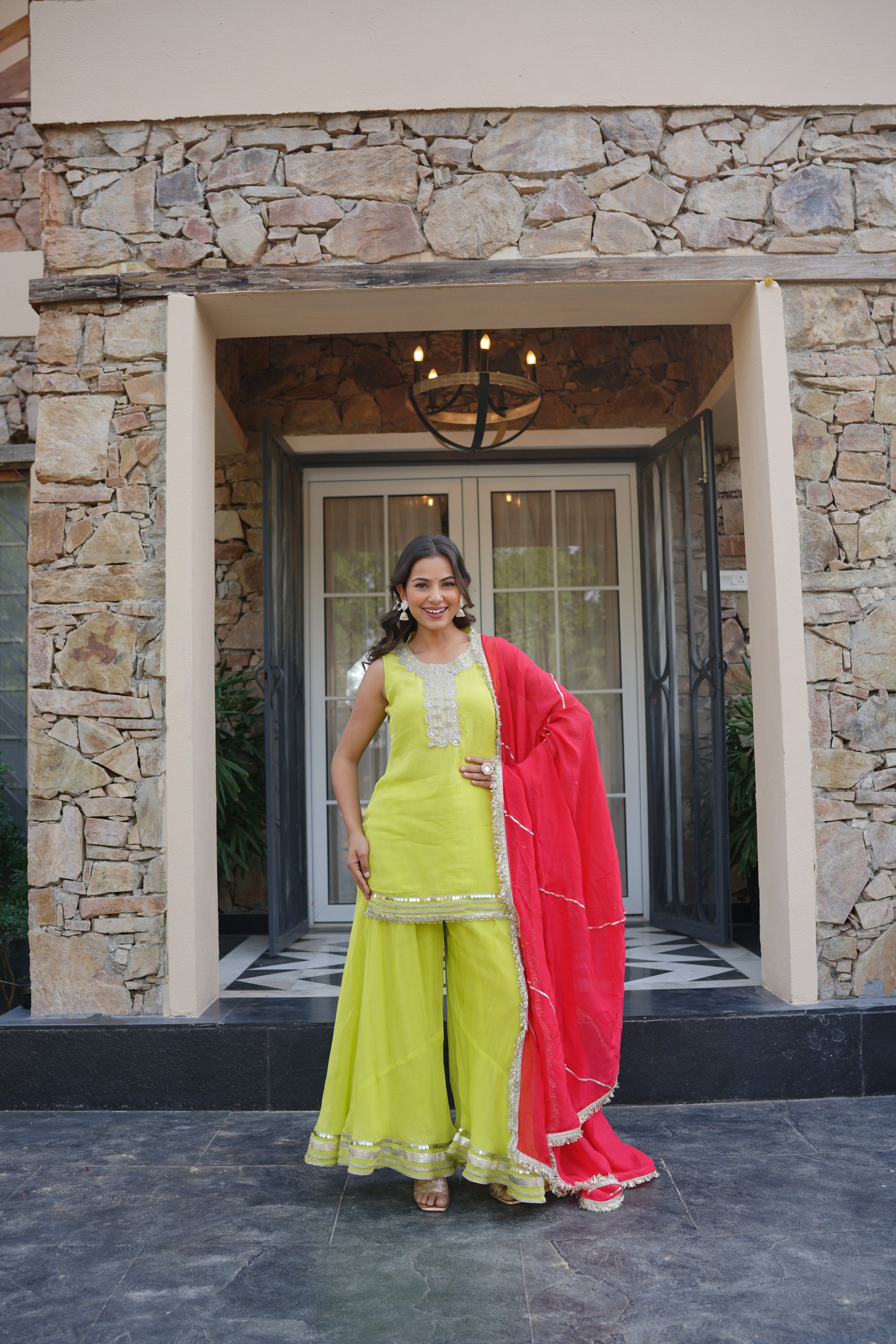 The Sajna Neon Sharara Set celebrates vibrant femininity with a bold yet graceful charm. Crafted from luxurious viscose organza with a soft cotton lining, this sleeveless kurta is designed to stand out. Its radiant neon hue is accentuated with delicate mirror work, exuding a festive sparkle perfect for wedding functions or joyful gatherings. The 34-inch kurta features a round-cut neckline — 7 inches in the front and 11 inches at the back — offering a flattering and structured fit.