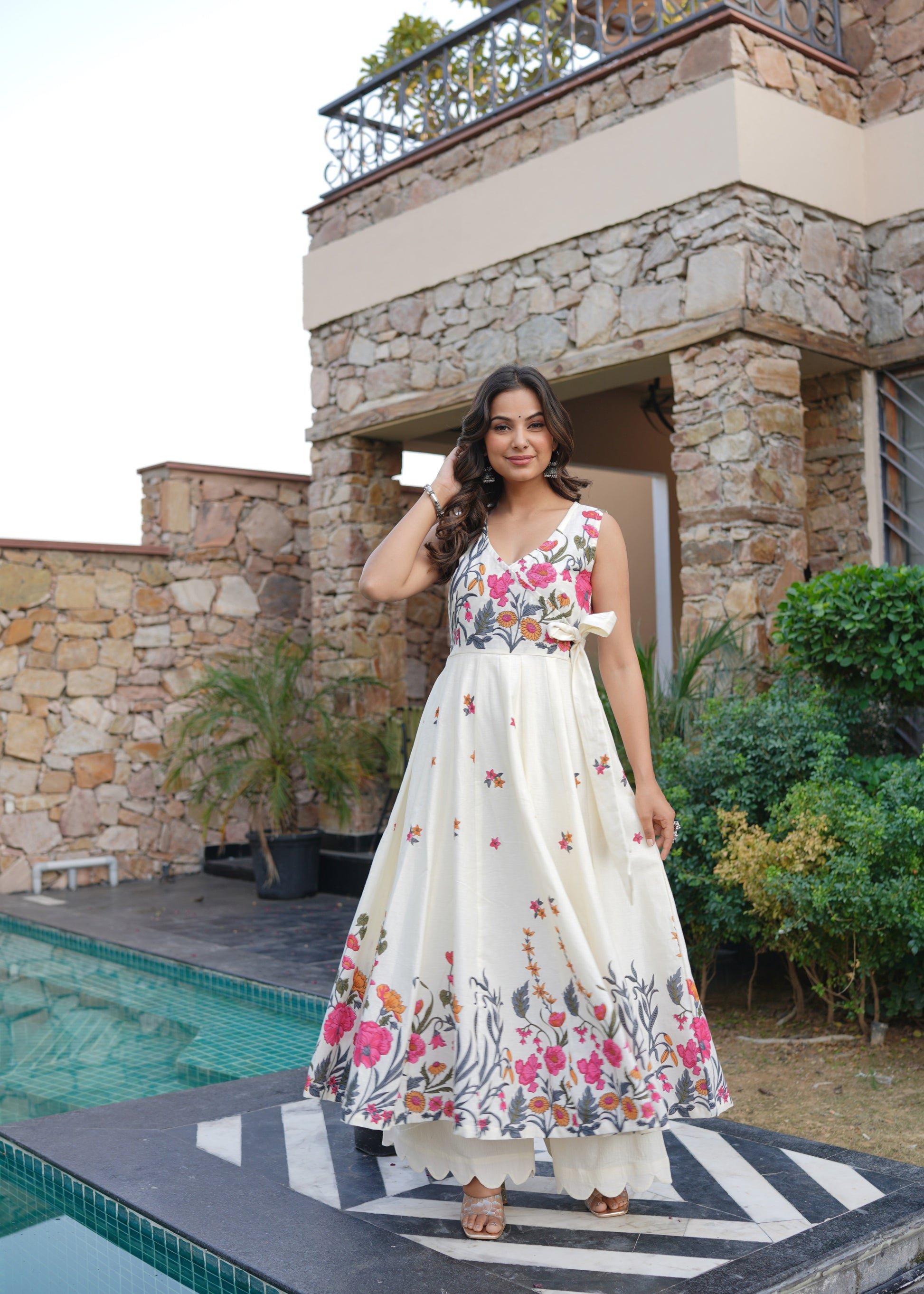 The Vamika Cotton Kurta Set embodies effortless elegance with a touch of artistry. Crafted from soft cotton flex, the sleeveless kurta features a 48-inch flowy silhouette adorned with delicate floral embroidery that captures the essence of feminine grace. The 7-inch front neckline and closed-back design bring structure and poise, while the subtle bow detail at the side adds a modern, playful touch.